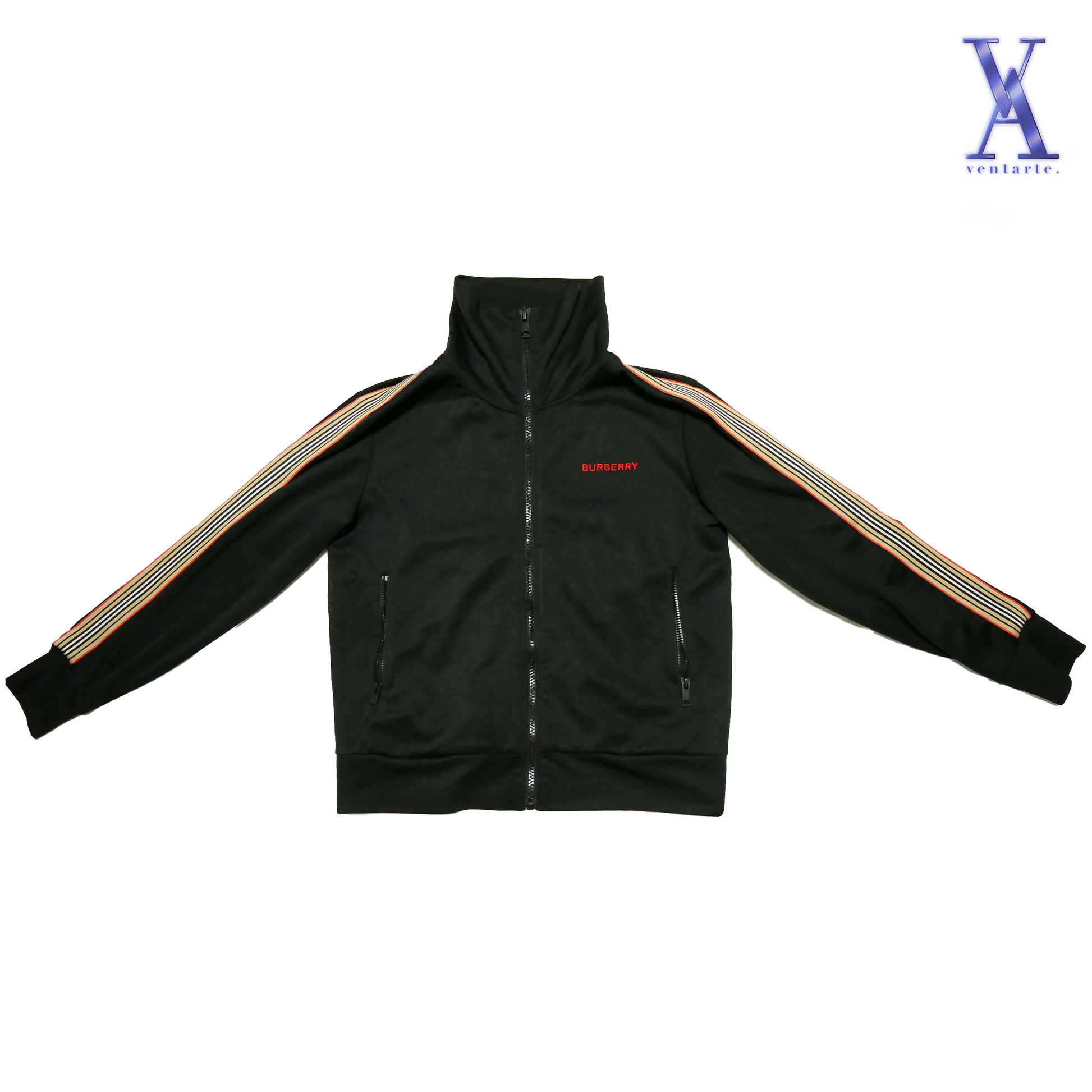 Diese elegante Trainingsjacke von BURBERRY ist mit einem farbenfrohen Seitenstreifen versehen und besticht in elegantem Schwarz. Der lange Kragen bietet zusätzlichen Schutz vor kälte und verleiht dem sportlichen Look eine stilvolle Note.